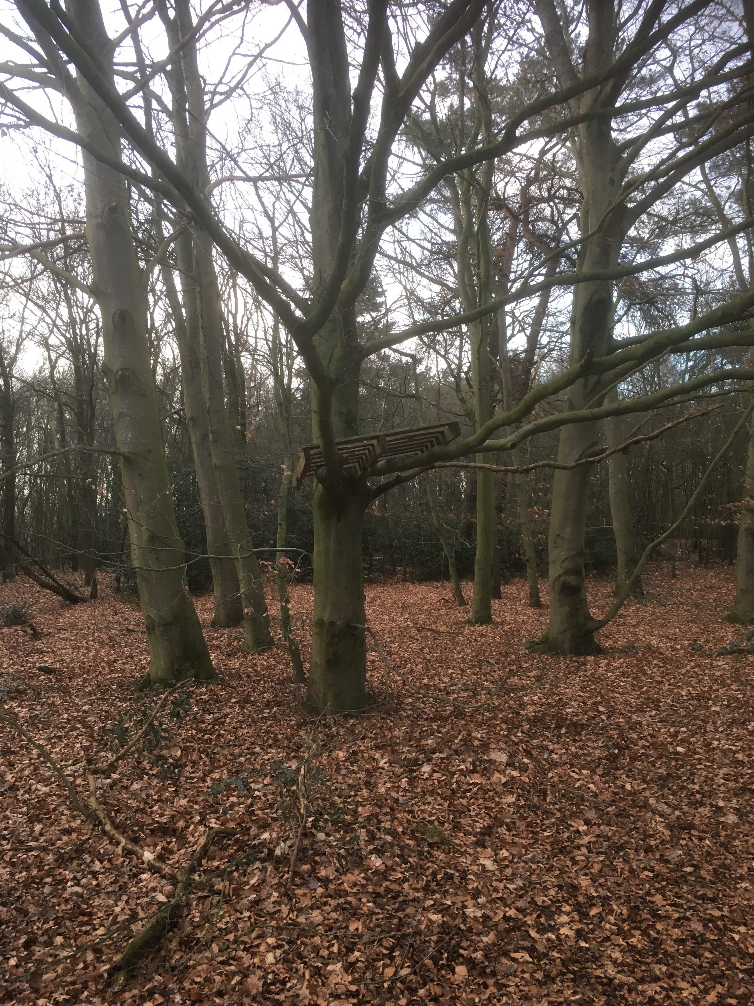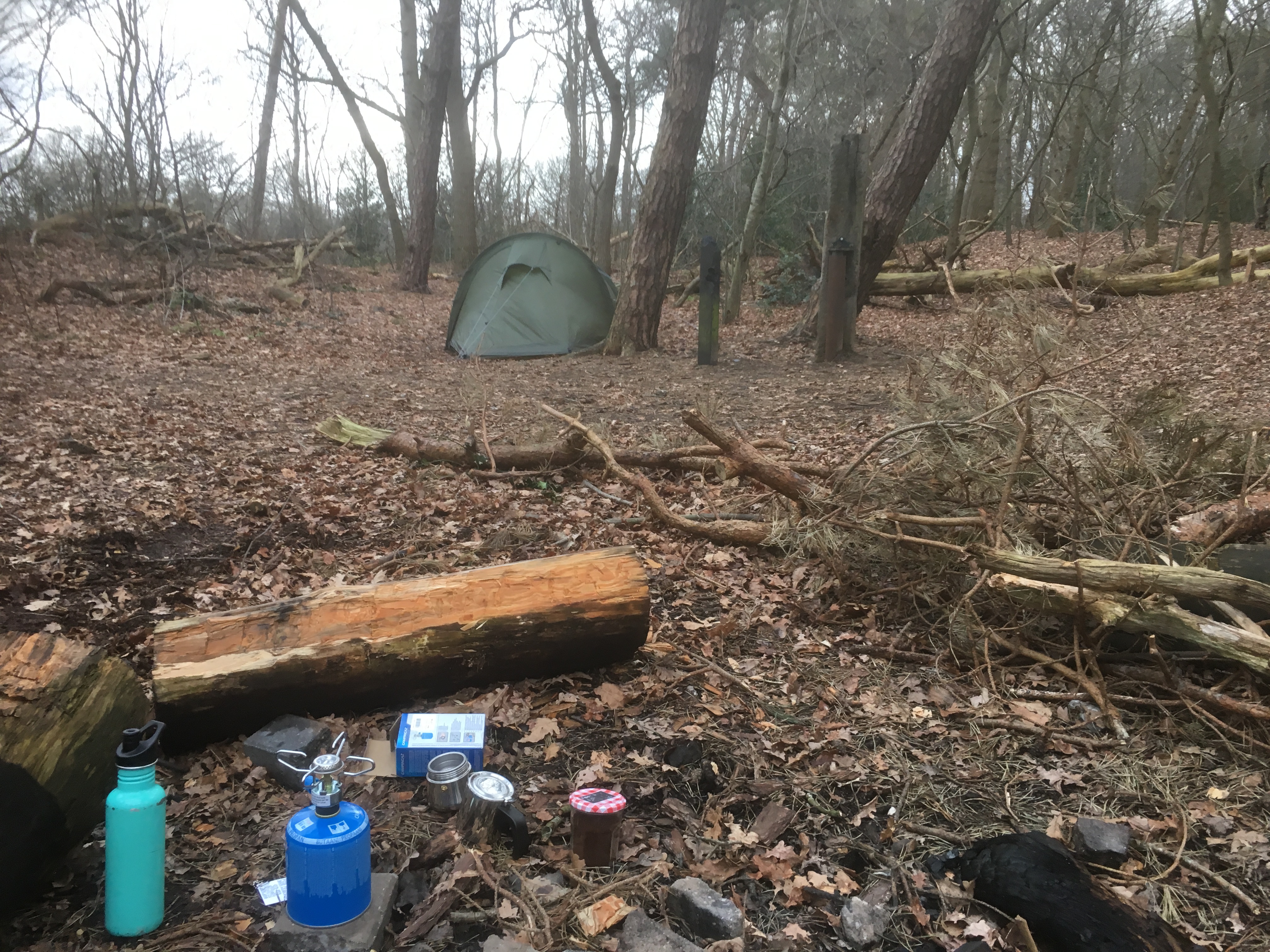 Inmiddels staat mijn tent, en nu? In de briefing van Walden.nu las ik over een oefening waarbij je een uur lang op een plek blijft zitten. Het idee is dat je de fases van onrust, verwondering en verveling doormaakt. Pas daarna dient echte ontspanning zich aan. Dat is het moment dat je meer samenvalt met de natuur en een dier bijvoorbeeld wel dichtbij zou kunnen komen. Dat lijkt me wel wat! Ik loop de Zwarte Dennen in en zie na een tijdje een vlonder in een boom waar ik in ga zitten. Een uur is wel ontzettend lang vind ik. Ik besluit dat 45 minuten ook wel genoeg is. Daarna loop ik snel naar de tent, ik moet nog koken, het wordt bijna donker en ik wil graag vuur maken anders krijg ik het koud. De fase van ontspanning is duidelijk nog niet bereikt……. Zittend voor mijn niet echt geslaagde vuurtje, het hout is vochtig, ben ik vooral heel alert. Ik hoor allerlei geluiden: krakende en piepende bomen, de wind, het vuur. M’n zintuigen staan op scherp, toch ook wel spannend. In de tent houdt het me nog bezig voordat ik in slaap val….